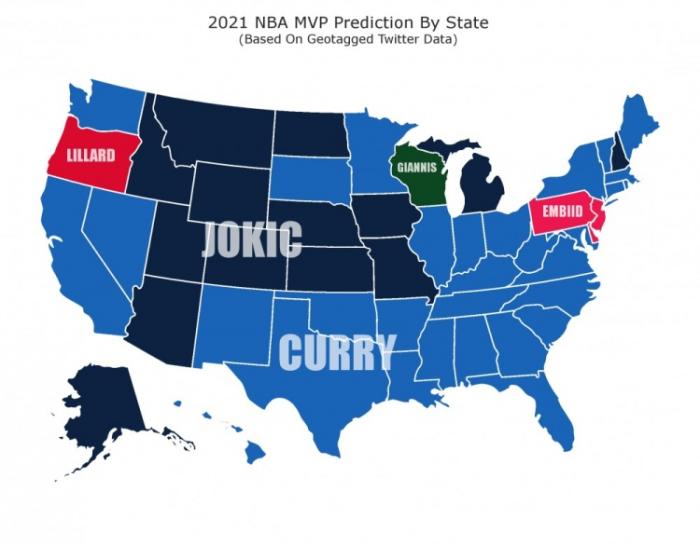 昨日美媒Sportsinsider.com发布了上月基于推特数据的MVP地图(上月30万条推特数据统计,更像是人气比拼)。其中数据显示,金州勇士球星库里是上月最受欢迎的MVP,美国有31个州支持库里MVP,14个州支持约基奇MVP,3个州(宾夕法尼亚州,76人所在地,还有赫拉华州和新泽西州)支持恩比德MVP。