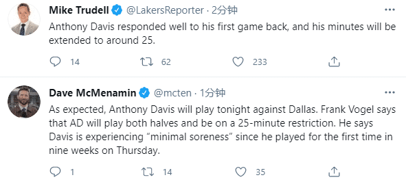 JRS直播网讯 湖人再次对阵独行侠之前,沃格尔透露浓眉复出首战后的感受,并且明确表示浓眉复出第二战将会出战25分钟,也透露了湖人最后13场比赛的计划。