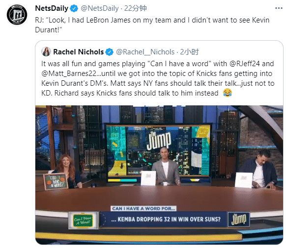 在Rachel Nichols《我可以说句话吗?》节目中,理查德-杰弗森和马特-巴恩斯激烈讨论篮网和尼克斯可能相遇季后赛的话题;谈到纽约球迷该不该和杜兰特谈话时,马特-巴恩斯觉得没必要,但杰弗森表示很有必要,期间他还直言:听着,我的球队中有詹姆斯,我不想看到杜兰特。