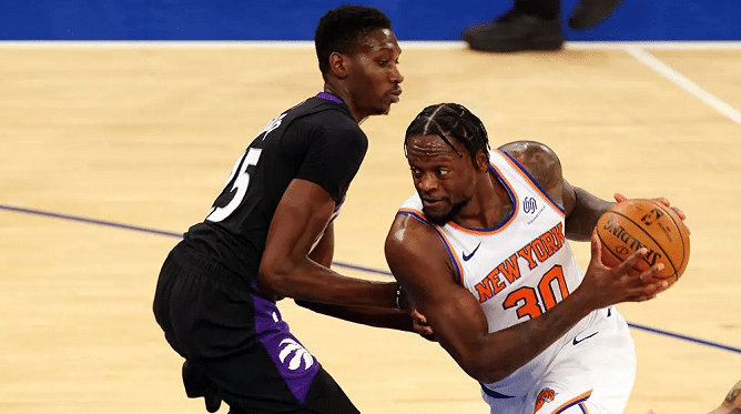JRS直播网讯 今天NBA常规赛继续进行,纽约尼克斯延续他们的出色表现,主场120-103战胜猛龙,稳居东部前四。兰德尔连续两场比赛至少砍下30分10篮板的数据,也是尼克斯最近8年来第一人,上一个做到的是安东尼。同时九连胜也是尼克斯过去25年以来的第二连胜纪录,他们目前的战绩来到34胜27负,55.7%的胜率;再加上球队近期的强势表现,这个赛季最大的黑马堪称纽约尼克斯。