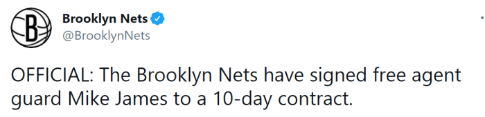 JRS直播网讯 北京时间4月24日,篮网官方宣布,球队已经用一份10天短合同和后卫迈克-詹姆斯签约,并晒图欢迎他来到布鲁克林。据悉,他在今天对凯尔特人一战中已经具备出场资格,有望迎来首秀。30岁的詹姆斯身高1米85,本赛季之前效力于莫斯科中央陆军,由于与主教练发生冲突遭到球队无限期停赛,随后,他在4月初返回美国。
