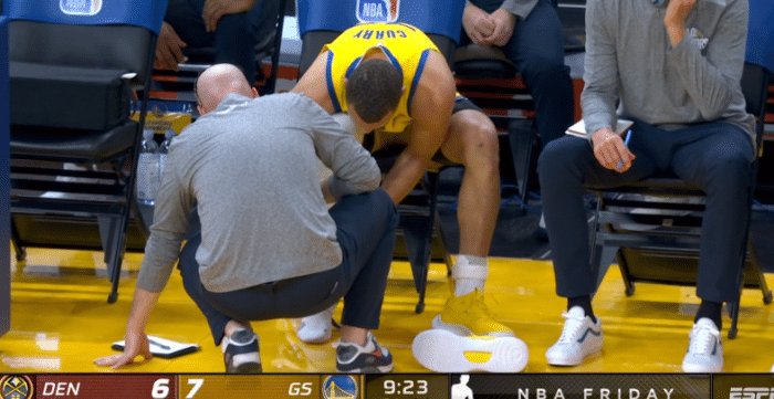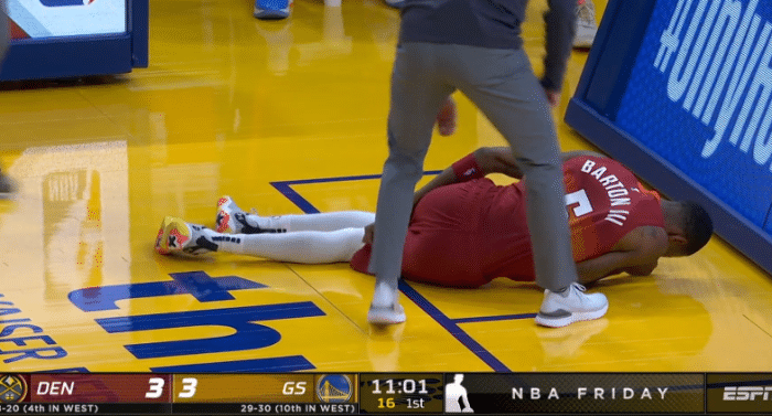 JRS直播网讯 北京时间4月24日,勇士和掘金比赛中,比赛仅仅只打59秒,场上发生意外伤病事件,掘金主力球员巴顿受伤倒地不起,捂着大腿十分痛苦,掘金队医赶紧冲过来;随后巴顿一瘸一拐走回更衣室;没过多久,库里也受伤离场。
