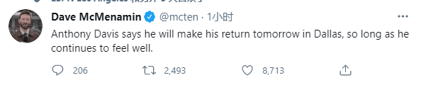 浓眉表示:我已经100%痊愈,不会冒着受伤的风险回归。如果继续感觉良好,我将在明天对阵独行侠的比赛中复出。