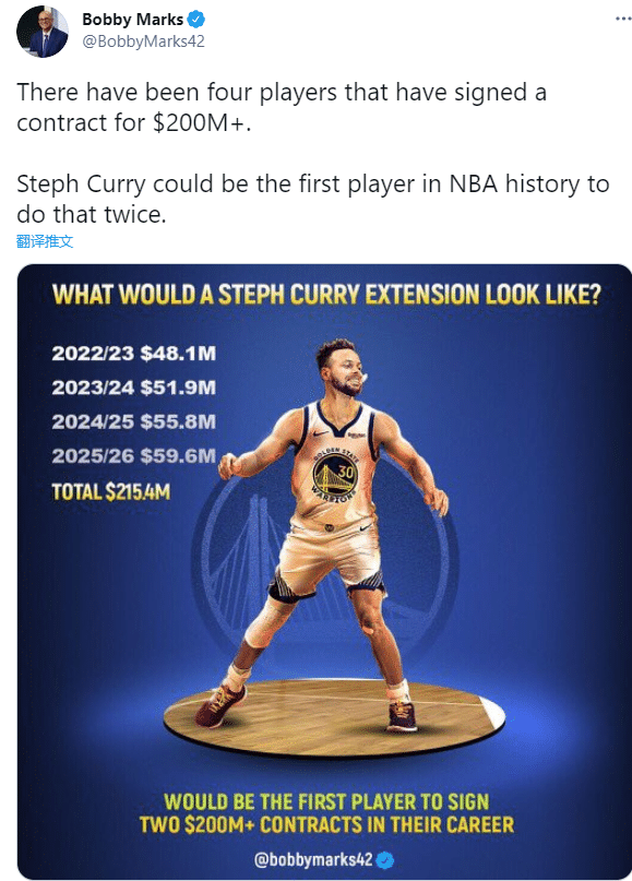 JRS直播网讯33岁库里还能拿到一份顶薪大合同吗?据薪资专家Bobby marks分析,库里有可能和勇士续签一份4年2.15亿美元的超级顶薪,若成功续签2亿顶薪,库里将会成为NBA历史上第一位拿到两份2亿顶薪的球员。