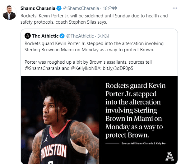 据名记报道,火箭新星小波特因陪同斯特林-布朗前往夜店,触发联盟防疫协议从而被隔离;NBA明文规定,禁止任何球员前往夜店,可如今火箭多名球员违规逛夜店,小波特和斯特林-布朗只是其中两人,至于还有谁也违规了,联盟正在调查。