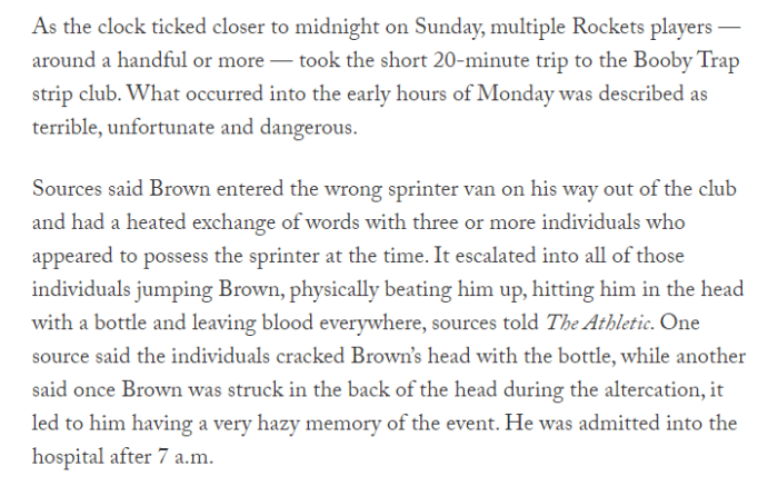 本来火箭队刻意安排球员住在远离市中区的酒店,但火箭队多名球员忍不住寂寞,凌晨前往夜店,大概做了20分钟的出租车;离开夜店时,斯特林-布朗因上错出租车与别人发生激烈冲突,惨遭殴打,后脑勺被击中以及脑袋被砸伤、全身以及面部多处被划伤,小波特为保护布朗而加入冲突。