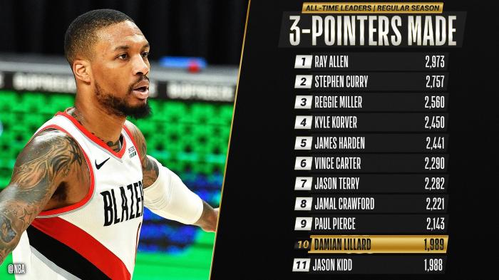 JRS直播网讯北京时间4月22日,开拓者和掘金比赛中,利拉德伤愈复出,复出首战的进攻状态不错,首节早早命中三分球,因此利拉德破纪录,常规赛三分命中数达到1989记,正式超越名宿贾森-基德(湖人助教),升到NBA历史三分榜第10位。