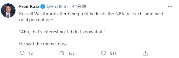 赛后记者问韦少关键时刻命中率联盟第一,韦少很惊讶,他表示:啊,那还挺有趣的,我不知道这个;韦少还表示球队需要自己做什么就能做什么,可以高效得分,可以传球也可以抢篮板。
