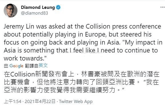 林书豪被问及去到欧洲打球的可能性,他表示自己的未来如果不在NBA的话,会将重心转移到亚洲参加比赛,因为在亚洲的影响力更大,也会促使自己更加的努力。