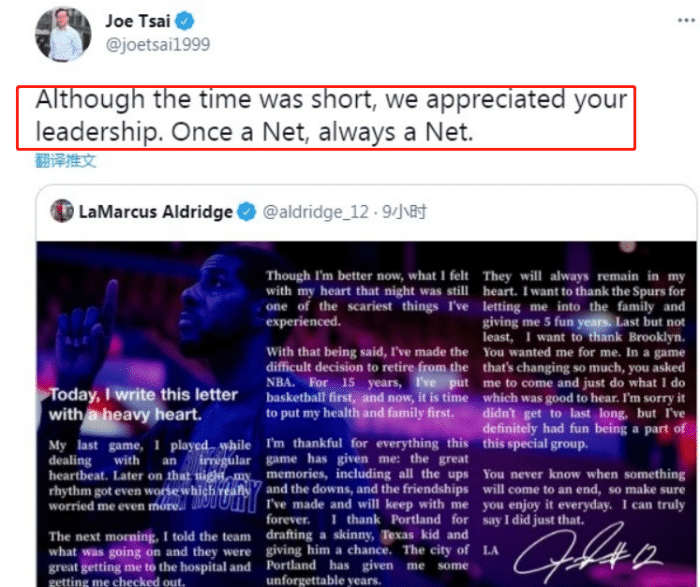 在阿尔德里奇宣布退役之后篮网老板蔡崇信更新了社媒,他的这番话让人觉得,如果篮网真的夺冠,阿尔德里奇非常有希望拿到冠军戒指。