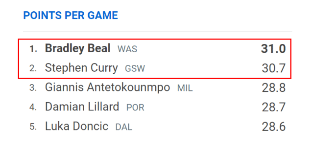 其一,库里在4月份的场均得分达到39.9分,高居联盟第一,而且是遥遥领先,同期排名第二的是爵士的米切尔,场均得分31分。如此疯狂的得分表现,也让库里的赛季场均得分提升到30.7分,距离排在首位的比尔(31.0分)只差0.3分。如果库里延续如此火热的手感,超越比尔只是时间问题。库里在2015-16赛季曾经成为联盟得分王,本赛季他有望再次拿到这项荣誉。