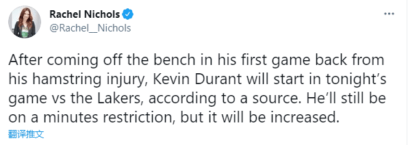 JRS直播网讯篮网再次变阵,据名记Rachel Nichols报道,杜兰特将在篮网对阵湖人比赛中首发出战,依旧会受到限时令,但上场时间比之前有所增加;此前杜兰特伤愈复出首战,被临时撤下首发并且替补上场;如今迎战卫冕冠军,杜兰特重返首发。