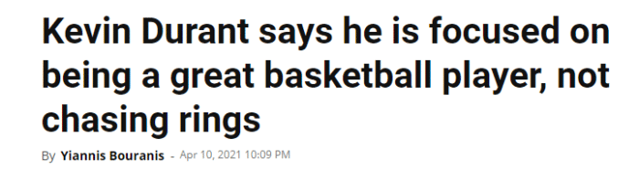 此前接受记者采访,杜兰特透露自己的生涯终极目标并不是总冠军,而是要成为一位伟大的篮球运动员,杜兰特表示:我想成为一名伟大的篮球运动员,而不是为了追逐人类创造的东西——戒指或者总冠军奖杯。