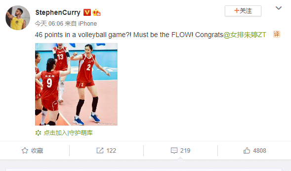 就在今天,NBA勇士球星库里在社交媒体上给朱婷送上祝贺,他发文: