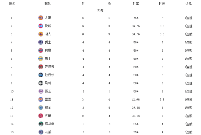 西部1-8名:太阳、快船、湖人、爵士、鹈鹕、勇士、开拓者、独行侠;