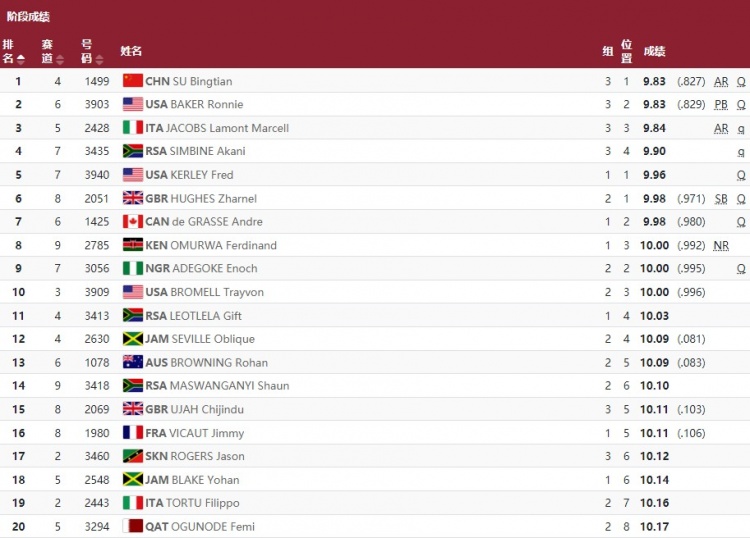 这个小组的竞争相当激烈,苏炳添0.142秒的出发反应列小组头位,他努力保持领先但第6道的罗尼-贝克紧追不舍,最终两人几乎同时抵达终点。苏炳添与罗尼-贝克成绩都是9秒83,苏炳添以9秒827排名小组第一,罗尼-贝克9秒829列小组第二。意大利的雅各布斯以9秒84获得小组第三,南非的非洲纪录保持者希姆宾以9秒90排名小组第5。