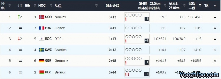 在第三棒的赛程里,俄奥队选手凭借精准的射击后来居上升至了第一的位置,随后抵达交接区的是瑞典和法国,中国的排名仍然是第16;第四棒俄奥队选手的射击依旧稳定,2个靶位都是6中5率先进入最后一段赛程,但挪威选手在最后的冲刺区完成反超,实现绝地翻盘夺金!法国也超过俄奥队拿到银牌,俄罗斯第三。