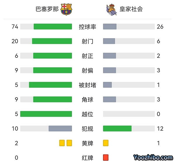 全场比赛结束,最终巴萨1-0击败十人皇家社会,挺进半决赛。