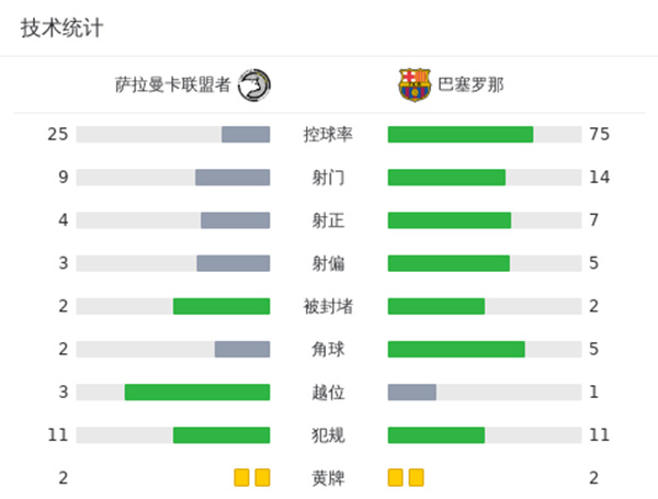 全场比赛结束,最终巴萨3-1逆转尤尼恩斯塔斯。
