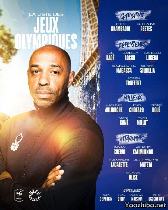 JRS直播网讯 法国国奥公布了参加巴黎奥运会的最终18人名单,无姆巴佩,拉卡泽特和刚刚加盟拜仁的奥利斯入选,三名超龄球员是巴代、拉卡泽特、马特塔,球队的主帅是法国传奇前锋亨利。