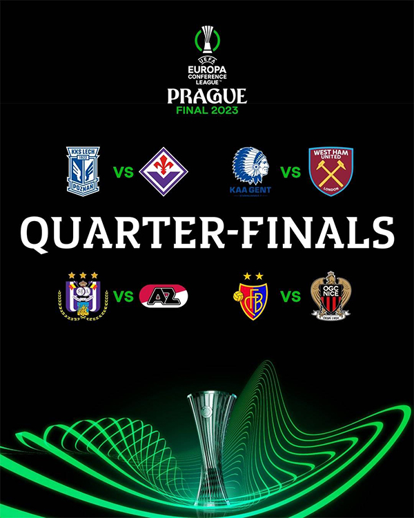JRS直播网讯 北京时间3月17日晚,2022-23赛季欧会杯1/4决赛抽签结果出炉:波兹南莱赫VS佛罗伦萨、根特VS西汉姆联、安德莱赫特VS阿尔克马尔、巴塞尔VS尼斯。