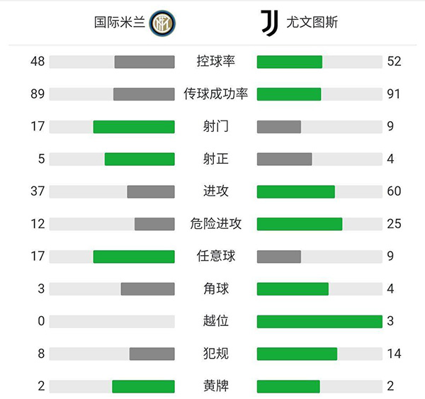 查看:国际米兰vs尤文图斯 全场录像技术统计: