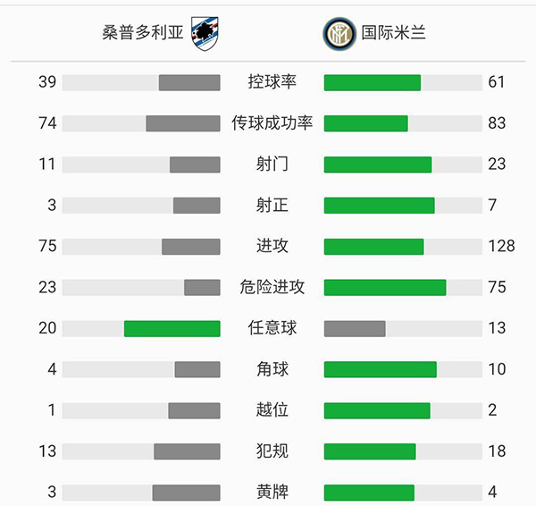 查看:桑普多利亚vs国际米兰 全场录像技术统计: