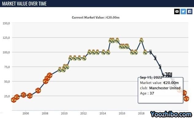 JRS直播网09月16日,德国《转会市场》更新了C罗的最新身价。37岁的葡萄牙巨星身价已经跌至2000万欧元,这也是他职业生涯第2低的身价。他上一次身价更低还是2004年职业生涯刚起步时,为1800万欧元。